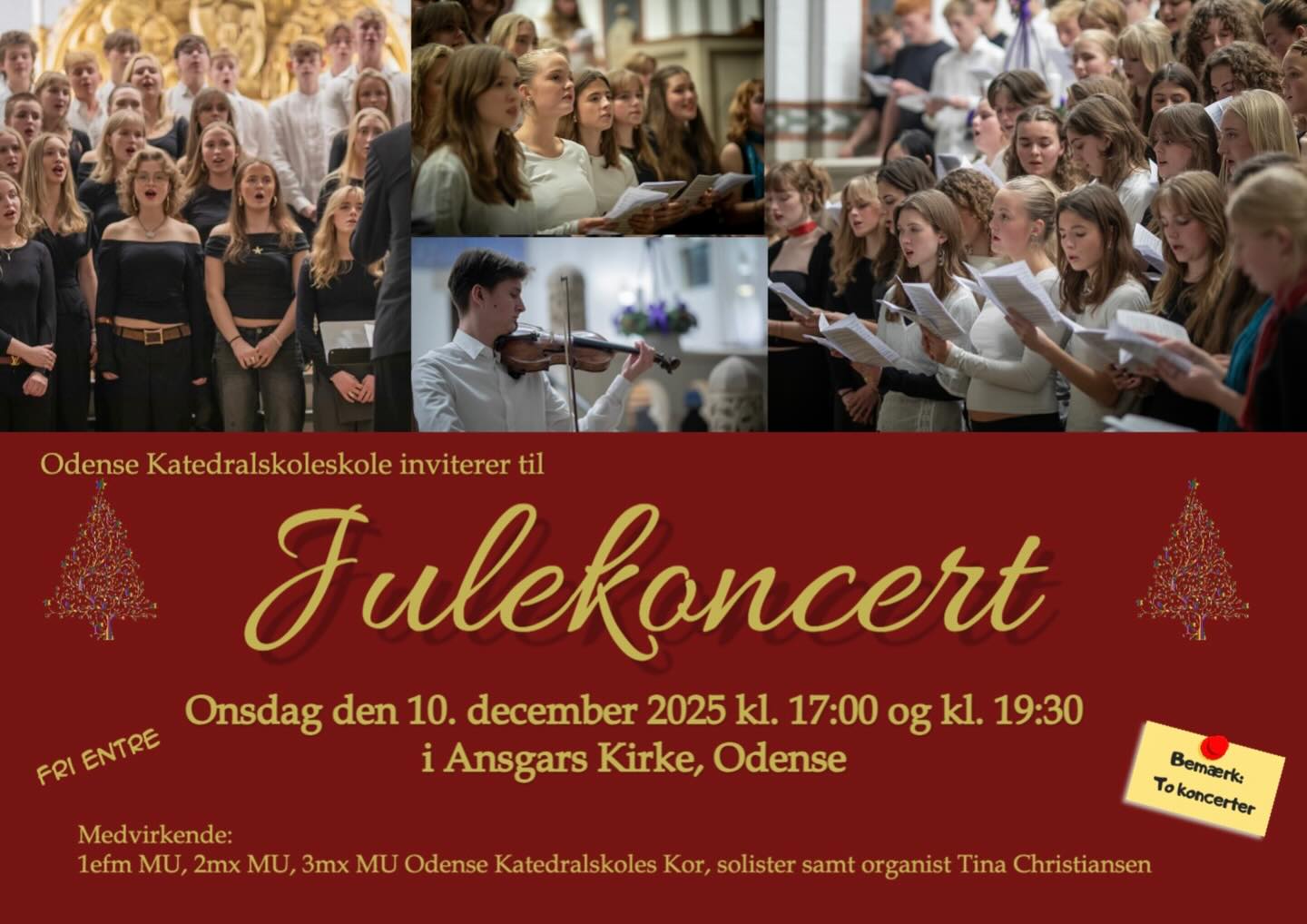 Onsdag den 10. december inviterer vi til den årlige og traditionsrige julekoncert i Ansgars Kirke. Der er to koncerter, så vi har plads til alle vores koncertgæster, så kom til koncert kl. 17:00 eller kl 19:30 og oplev vores dygtige musikstudieretningsklasser, skolens kor og MGK-elever optræde. Koncerten afsluttes med to flotte fællesnumre, og I kan godt glæde jer